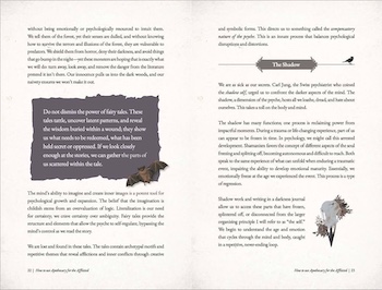 I also love the layout and illustrations done by Wicker-Campbell. The material can definitely get a bit heavy, bringing up past memories or fears held deep within, but the little skulls, candles, cobwebs and spiders throughout remind me that I’m wading into a realm of death in order to become more fully alive. The illustrations help ground abstract psychological work are an invitation to slow down, digest, and sit with complex emotional material. Additionally, the fairy tales being white text on a darker page helps me to switch my mindset when reading, making me more receptive to the story.