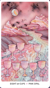 “The Eight of Cups is confirmation that you’re right–the vibes are off. Maybe on the outside everything looks fine. And sure, you could ignore that whisper inside, push it down, keep going. But you know. Deep down, you know. This phase of your life has run its course. . . .Pink Opal assists in following the whispers of the heart towards your true, authentic path. As a crystal of renewal, it reconnects you with yourself and what you truly want on a soul level. While it reminds you of who you are, it brings peace, soothing calm, and relaxation so as to not overwhelm the nervous system when difficult choices must be made.”2